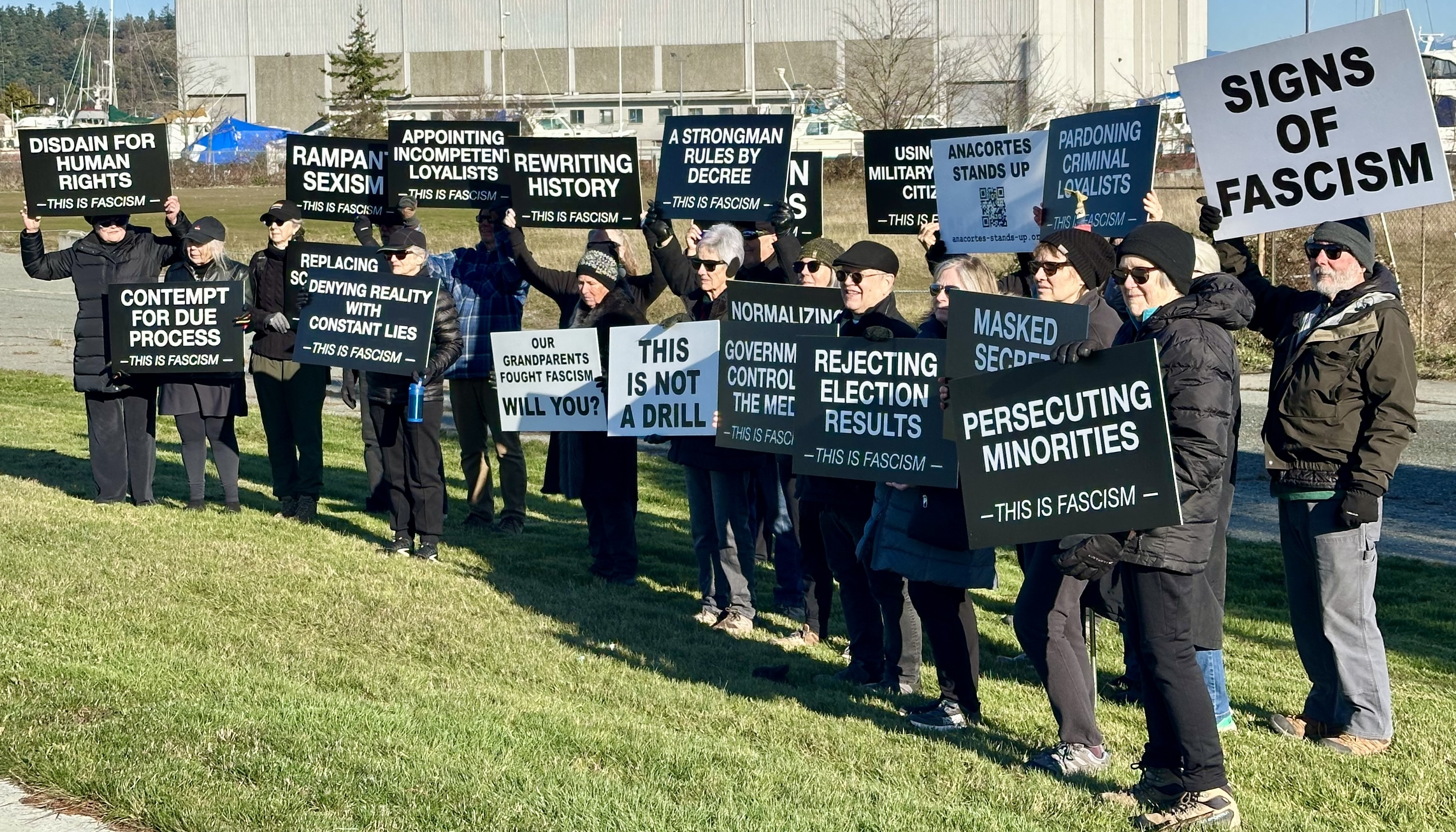 We've been holding these signs since January along an eight-block stretch of R Avenue in Anacortes. Our goal is to raise awareness that fascism is not just something we read about in history books. It didn't disappear with the defeat of Mussolini's Italy and Nazi German in WWII. No country is immune to fascism, and it can happen here.